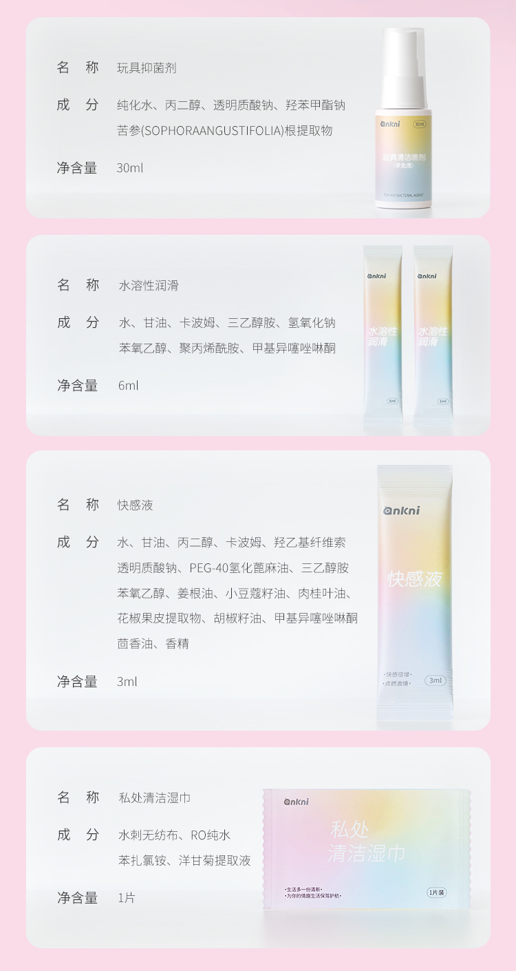 产品主要材质:喷剂*1+润滑*2+快感液*1+湿巾*2