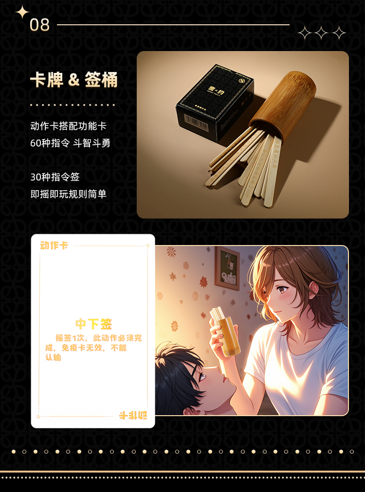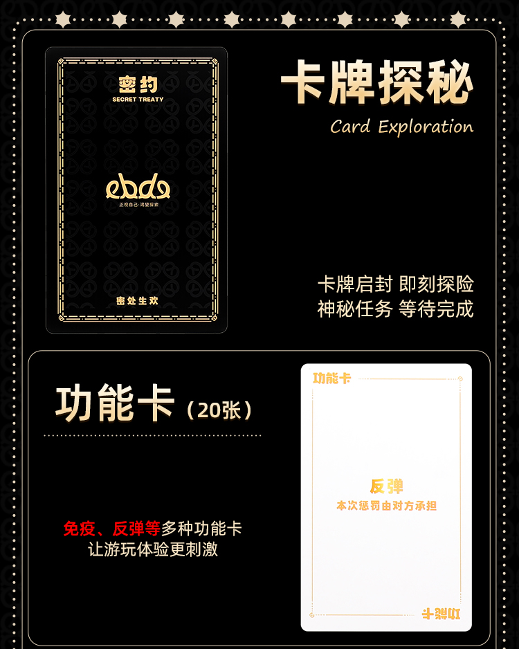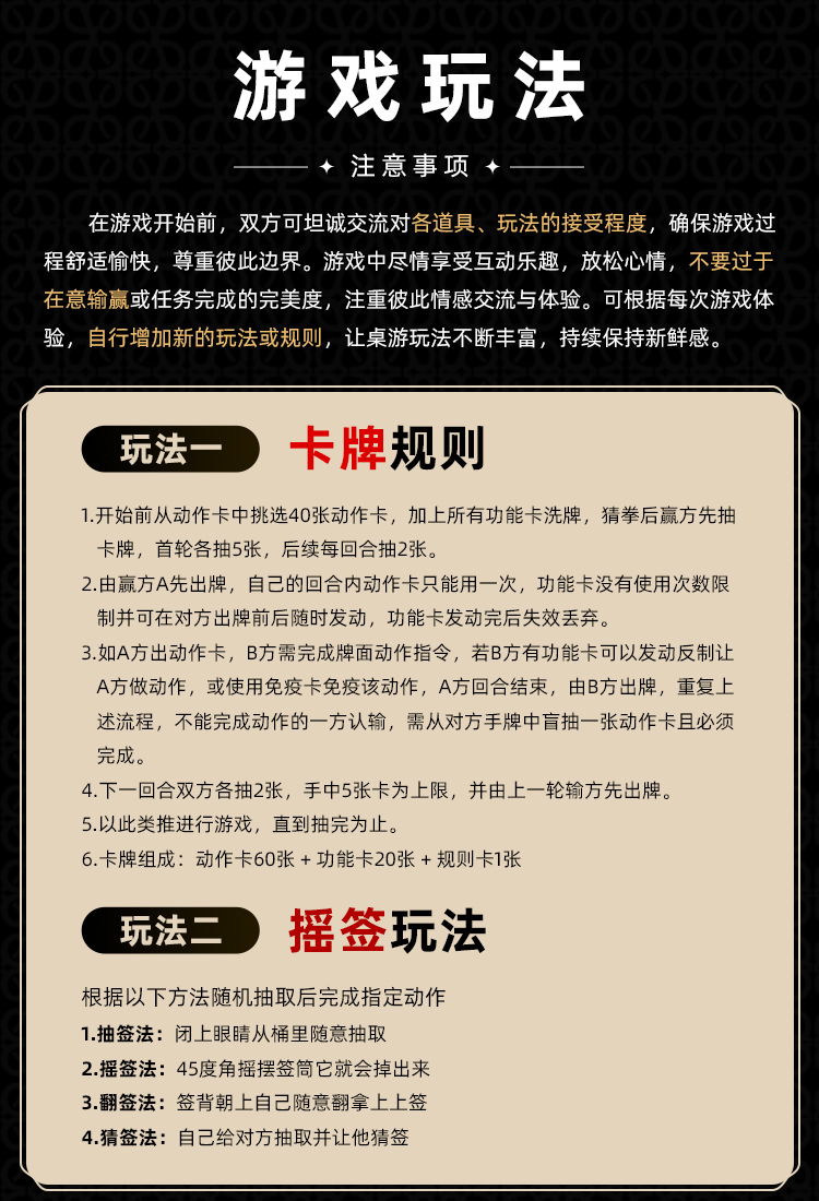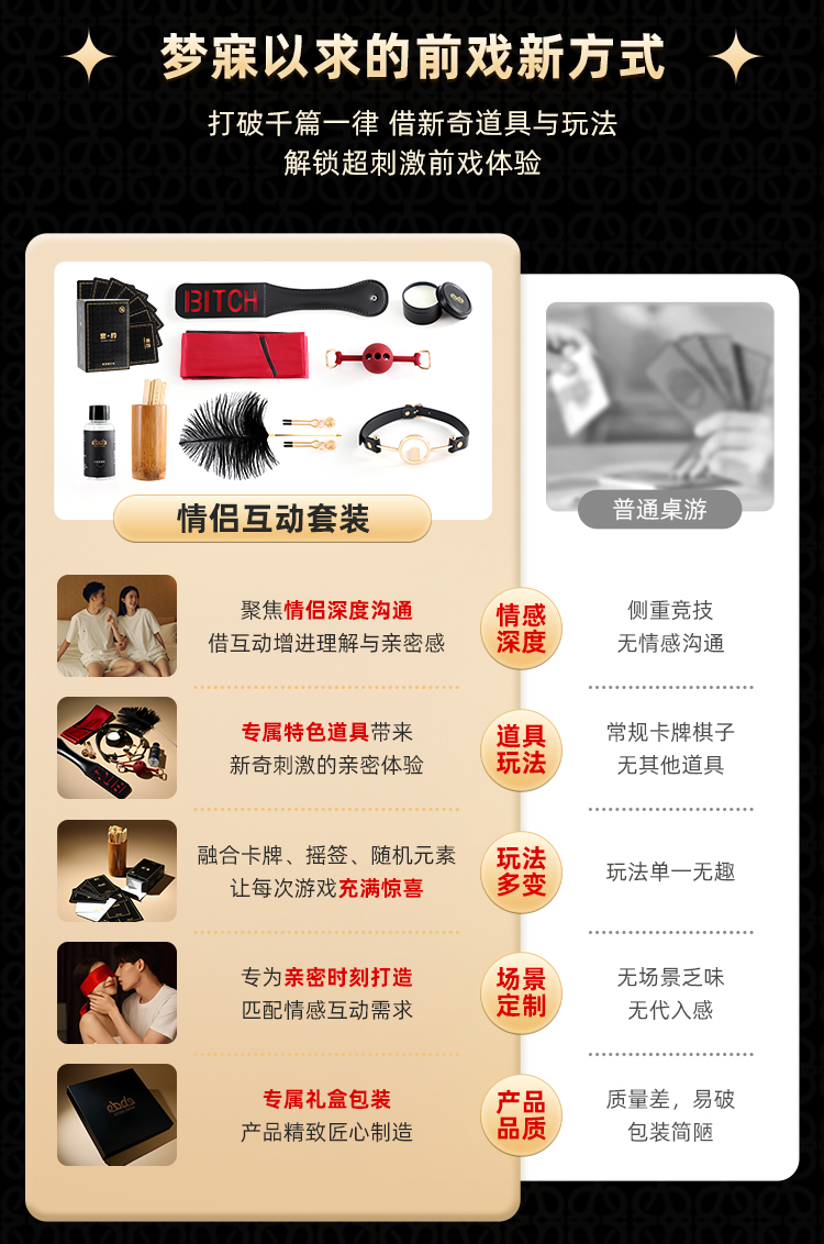 主要功能/卖点:情侣桌游,甜蜜升温,浪漫不低俗,特色道具搭配创新玩法。