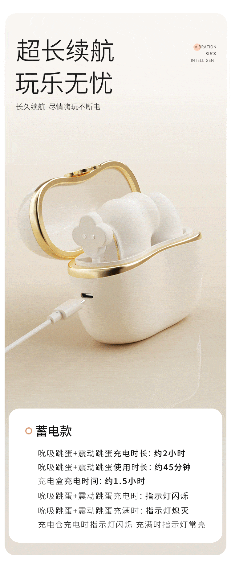 充电时长:充电仓1.5小时、吮吸跳蛋+震动跳蛋2小时