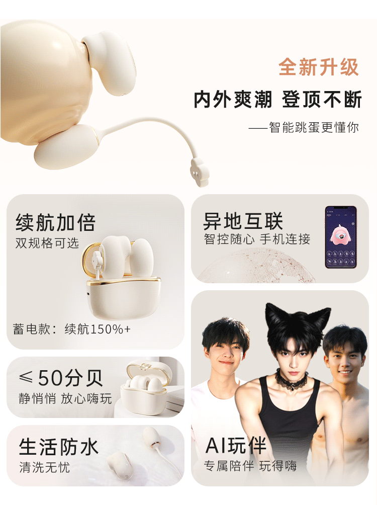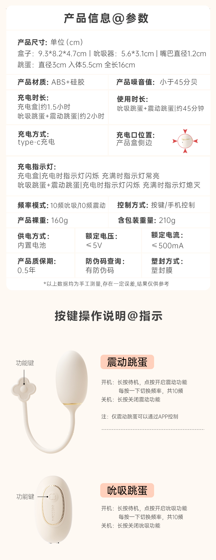 充电状态 :充电仓:灯光闪烁 、 吮吸跳蛋+震动跳蛋:灯光闪烁